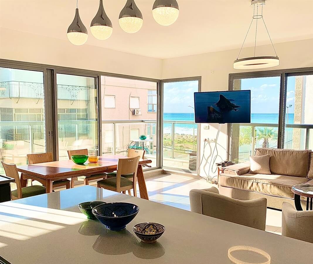 הכי גדולה ומפנקת שלנו (120 מ"ר). דירת נופש יוקרתית במרחק 30 מ' מהחוף. בדירה זו 3 חדרי שינה לצד סלון ענק ומסוגנן, 2 חדרי רחצה ומרפסת נוף המשקיפה לים. מתאימה לאירוח עד 6 נופשים.