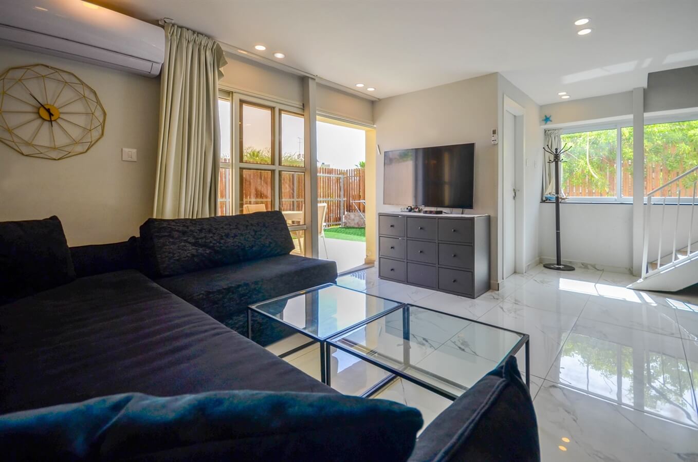 - סלון מרווח וגינה גדולה עם פינת ישיבה בקומה התחתונה