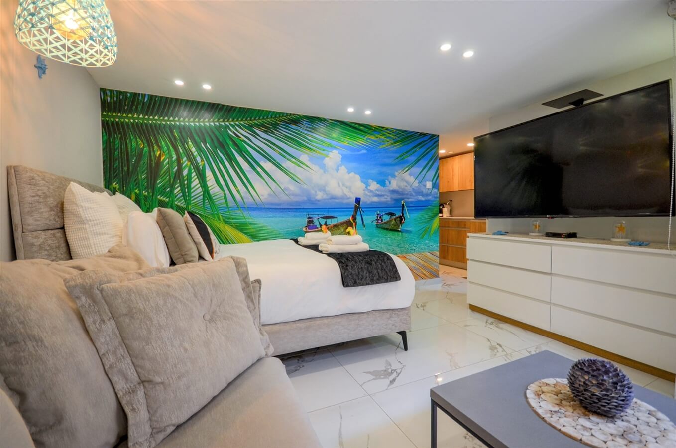 דירת סטודיו מסוגננת בהשראת הוואי עם מיטה זוגית, ספה, מכונת אספרסו, WIFI, חדר רחצה עם מגבות ומוצרי אמבט, טלוויזיה בחיבור לערוצי כבלים, מיזוג אוויר ומטבחון עם מקרר, תנור, טוסטר, מיקרו, כירה חשמלית וכלי בישול.