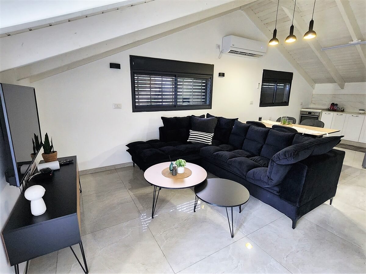 - סלון עם מערכת ישיבה וטלוויזיה חכמה בחיבור כבלים ונטפליקס