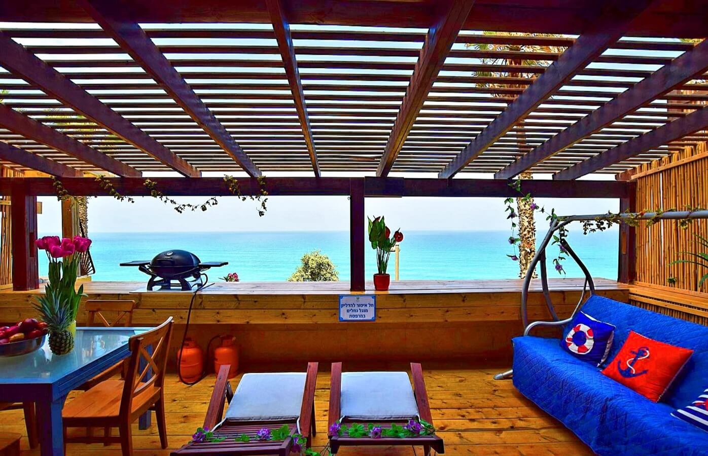 לדירה מרפסת עץ גדולה כ-100 מ"ר המשקיפה אל נוף עוצר נשימה של הים וכוללת ג'קוזי, שולחן סנוקר ופינות ישיבה.