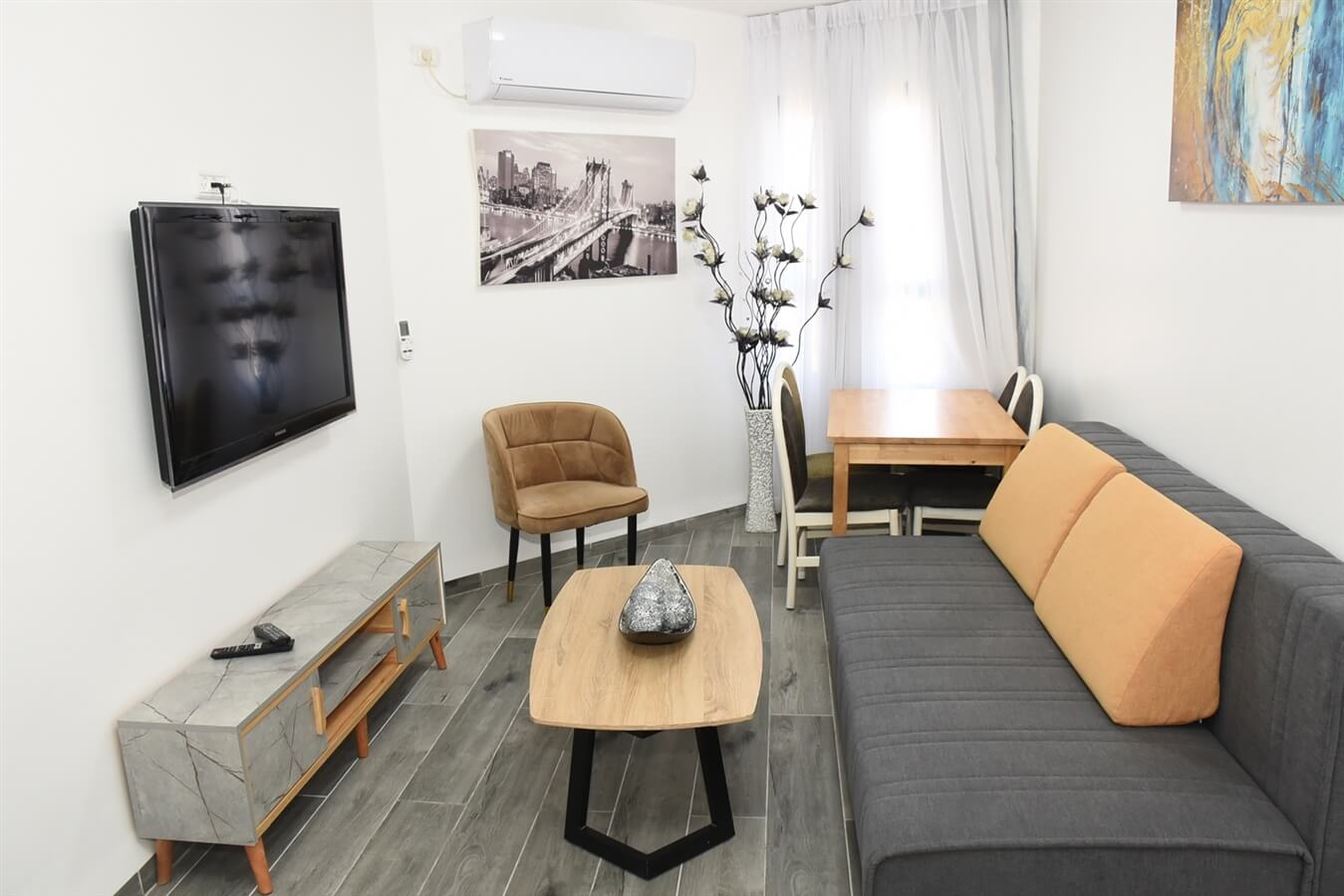 - סלון רחב בו ספת ישיבה הנפתחת למיטה זוגית ומסך טלוויזיה בחיבור לכבלים
