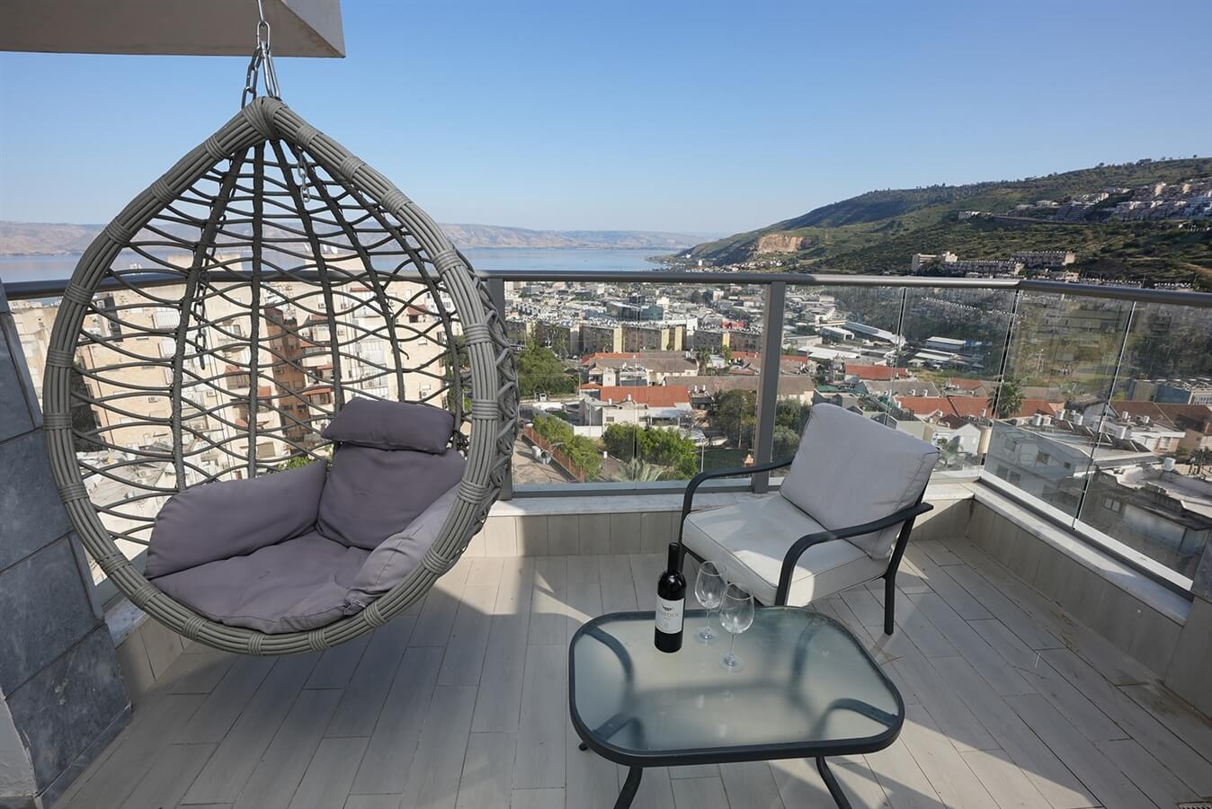 - מרפסת מהממת עם נוף עוצר נשימה לכנרת עם פינות ישיבה ונדנדה