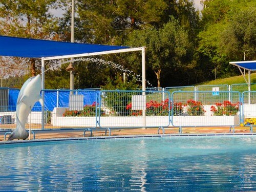 בריכה חצי אולימפית מוצלת באופן חלקי, בריכת פעוטות מוצלת ולצידן אזורים לאתנחתא ושיזוף.