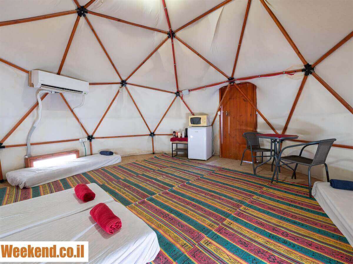 ליהנות מחווית אירוח מיוחדת במינה ל-5 איש ומעלה! לינה במבנים אקולוגיים מקסימים המוגנים מפני גשם וקור. הלינה הינה על מחצלות ומזרנים נוחים במבנה סגור בו חלונות ודלתות. בנוסף, תיהנו ממיזוג אוויר, שקעי חשמל, מקררים, מקלחות ושירותים ומים חמים.
