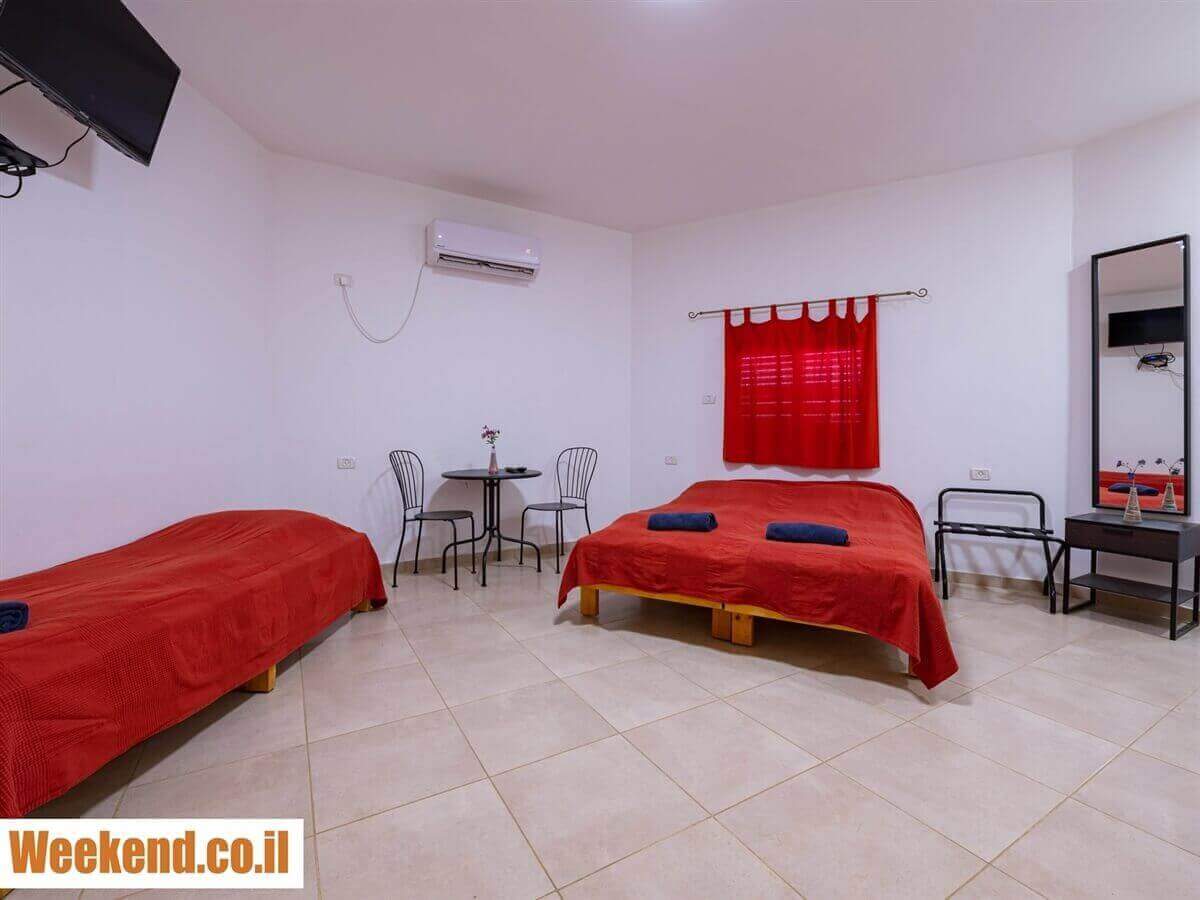 חדרי אירוח - בחדרי האירוח תיהנו ממיזוג אוויר, מיטה זוגית נוחה ומיטת יחיד, מסך טלוויזיה בחיבור לכבלים, חדר רחצה מטופח, מטבחון מאובזר עם מיני מקרר, פינת קפה ומרפסת צמודה. *יש להצטייד בציוד רחצה אישי