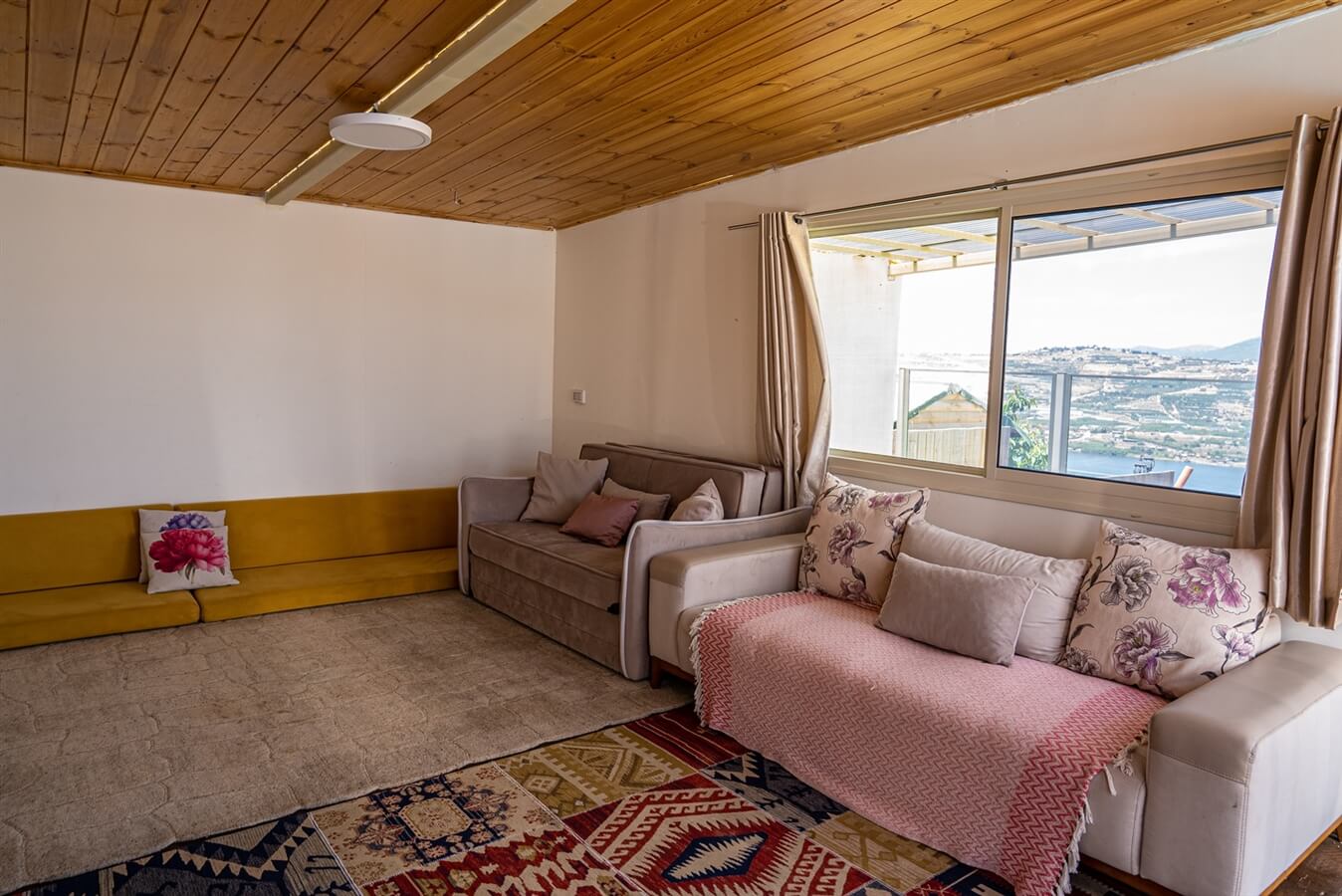 יחידת נופש מרווחת ל-4 איש הכוללת: ספה הנפתחת למיטה זוגית, ספה נוספת, מזרנים ומטבחון עם פינת קפה ומקרר
