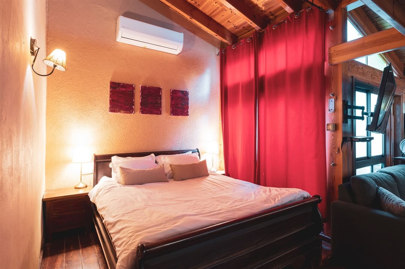 בקתת חרמונים בקתת עץ יפהפייה ומעוצבת בסגנון ייחודי, מושלמת לאירוח משפחתי. הבקתה מתאימה ללינה של עד 6 אורחים: זוג הורים, שלושה ילדים בגלריה עם סולם, וילד נוסף על ספה נפתחת ליחיד. לנוחותכם, הבקתה כוללת מטבחון מאובזר עם מקרר, מיקרוגל וכלי אוכל, וכן ג’קוזי ענק ומשפחתי לחוויית נופש מפנקת במיוחד.