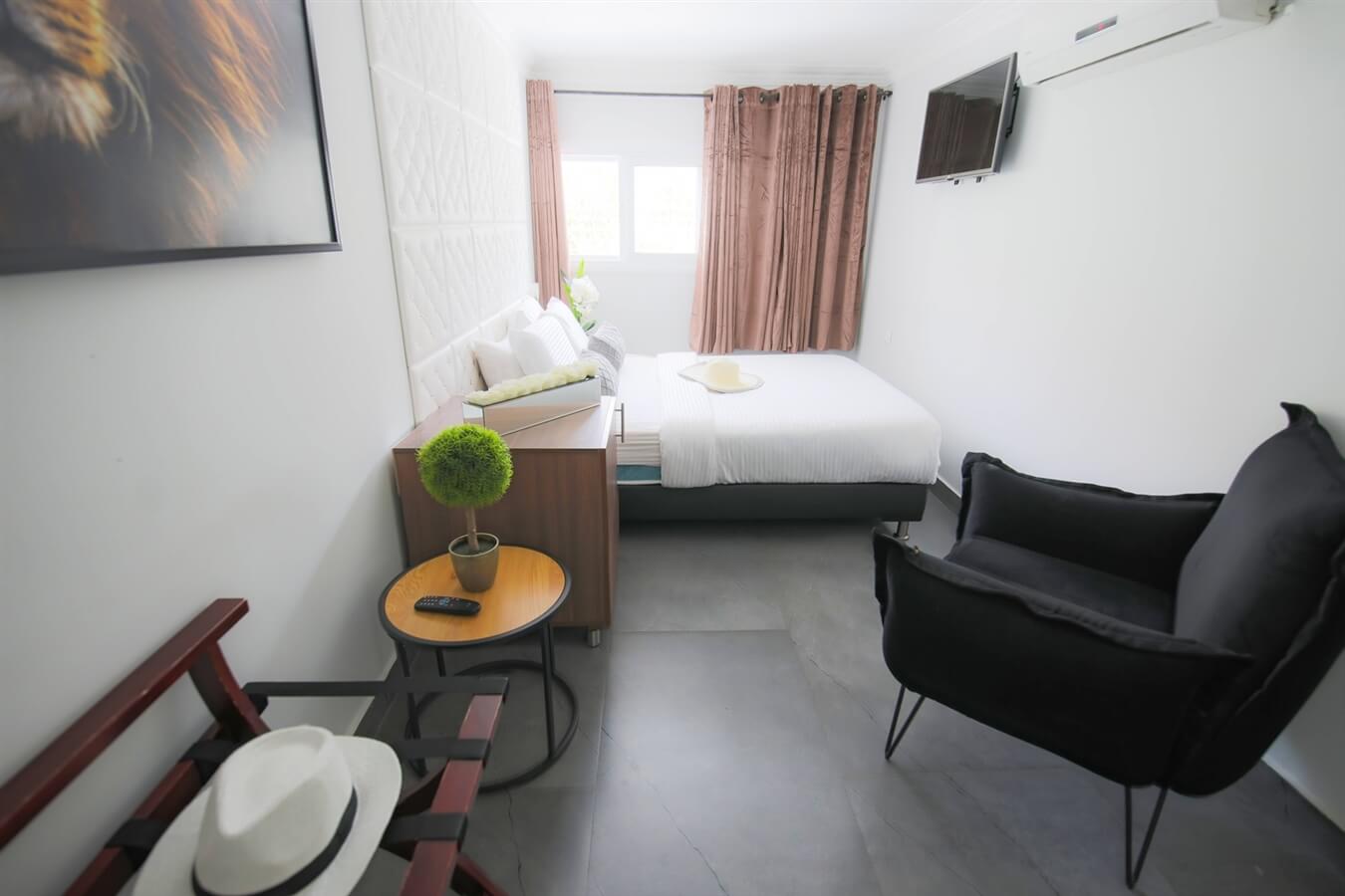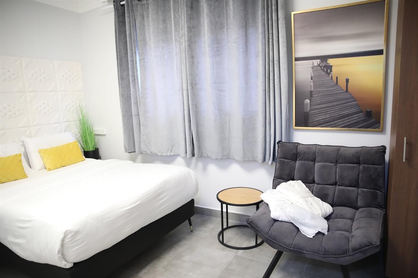 יחידת אירוח נעימה ומאובזרת המתאימה ליחידים עם מיטה זוגית נעימה, טלוויזיה חכמה עם חיבור ליוטיוב ונטפליקס, כספת, ספה נוחה וחדר רחצה עם אמבטיה מפנקת.