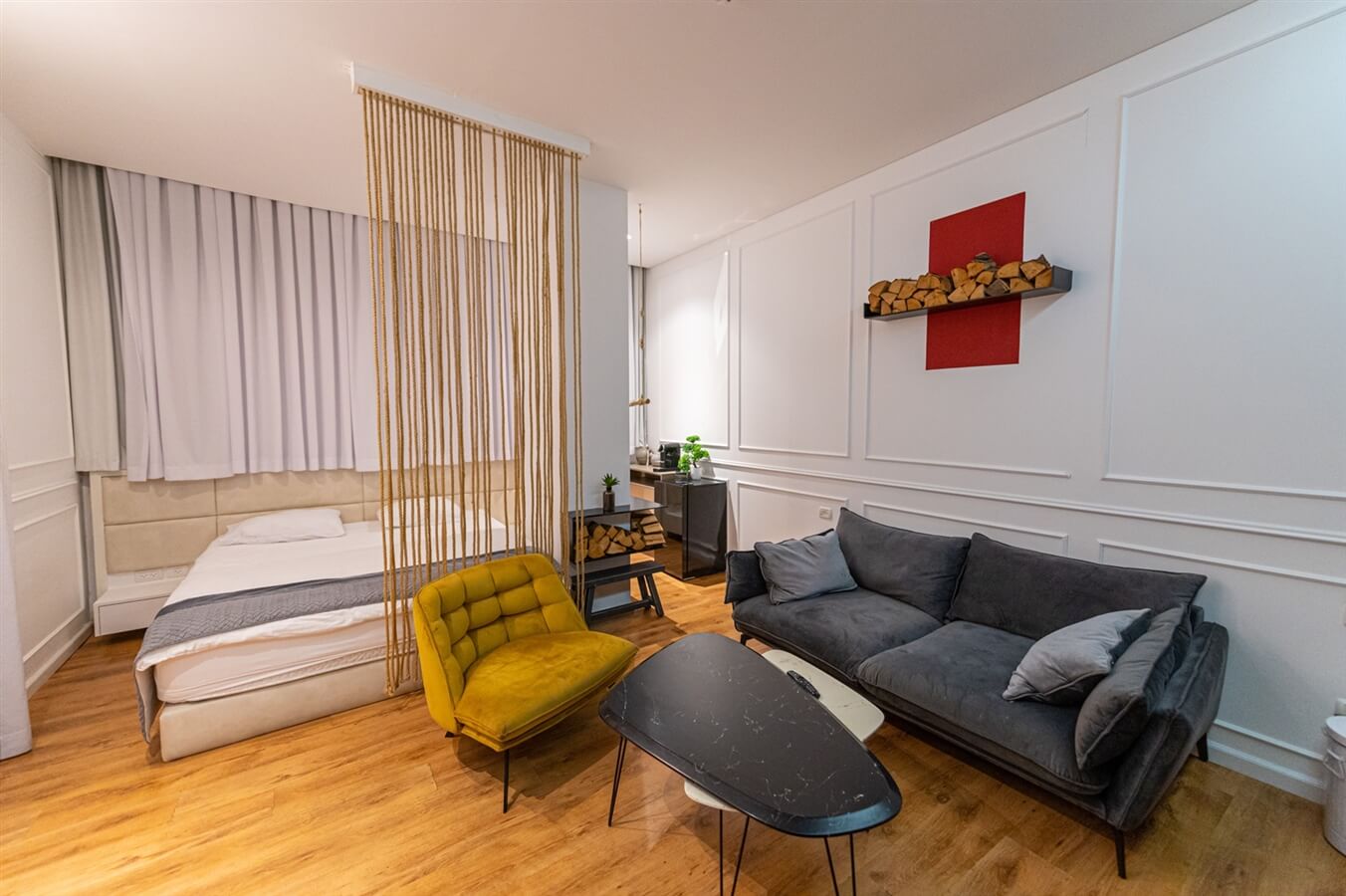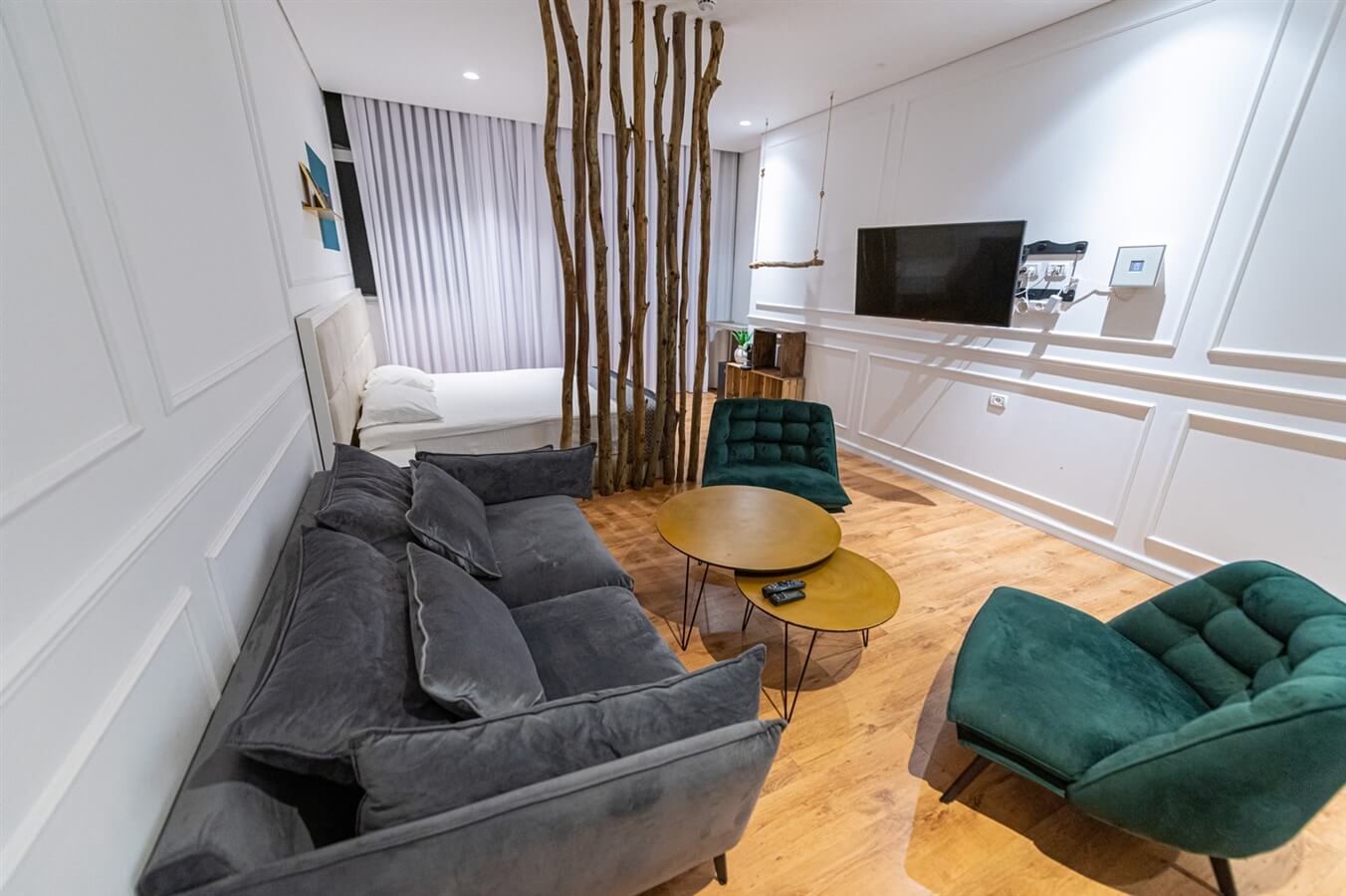 סוויטת E – סוויטה עם מיטה זוגית, פינת ישיבה סלונית, חדר רחצה, מקרר ומכונת קפה עם קפסולות, מסך טלוויזיה בחיבור נטפליקס ויוטיוב.