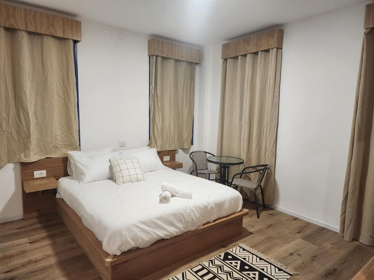 - חדר סטודיו: 10 חדרים מסוג זה, חדר בגודל 25 מר' המעוצב כחלל פתוח, מתאים לאירוח עד 4 איש, בחדר תמצאו מיטה זוגית נוחה, פינת קפה, מקרר, ארון בגדים, חדר רחצה עם תחליבים ומגבות, פינת ישיבה, טלוויזיה חכמה בחיבור לכבלים ונטפליקס, כספת ופן.