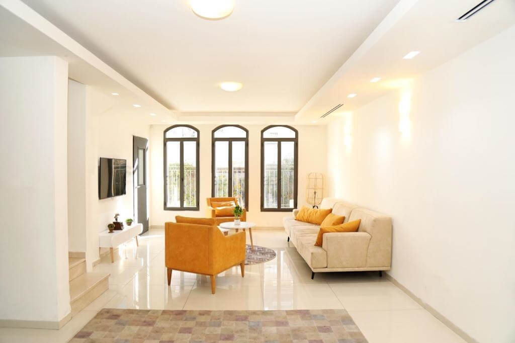 - סלון מושקע עם ספה נוחה, כורסאות וטלוויזיה חכמה עם חיבור לנטפליקס