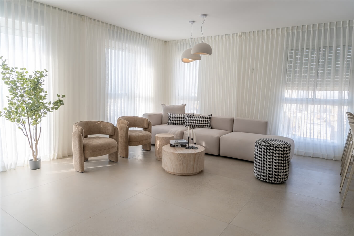 - סלון גדול ומרווח עם ספה, כורסאות, שולחן סלון וטלוויזיה חכמה
