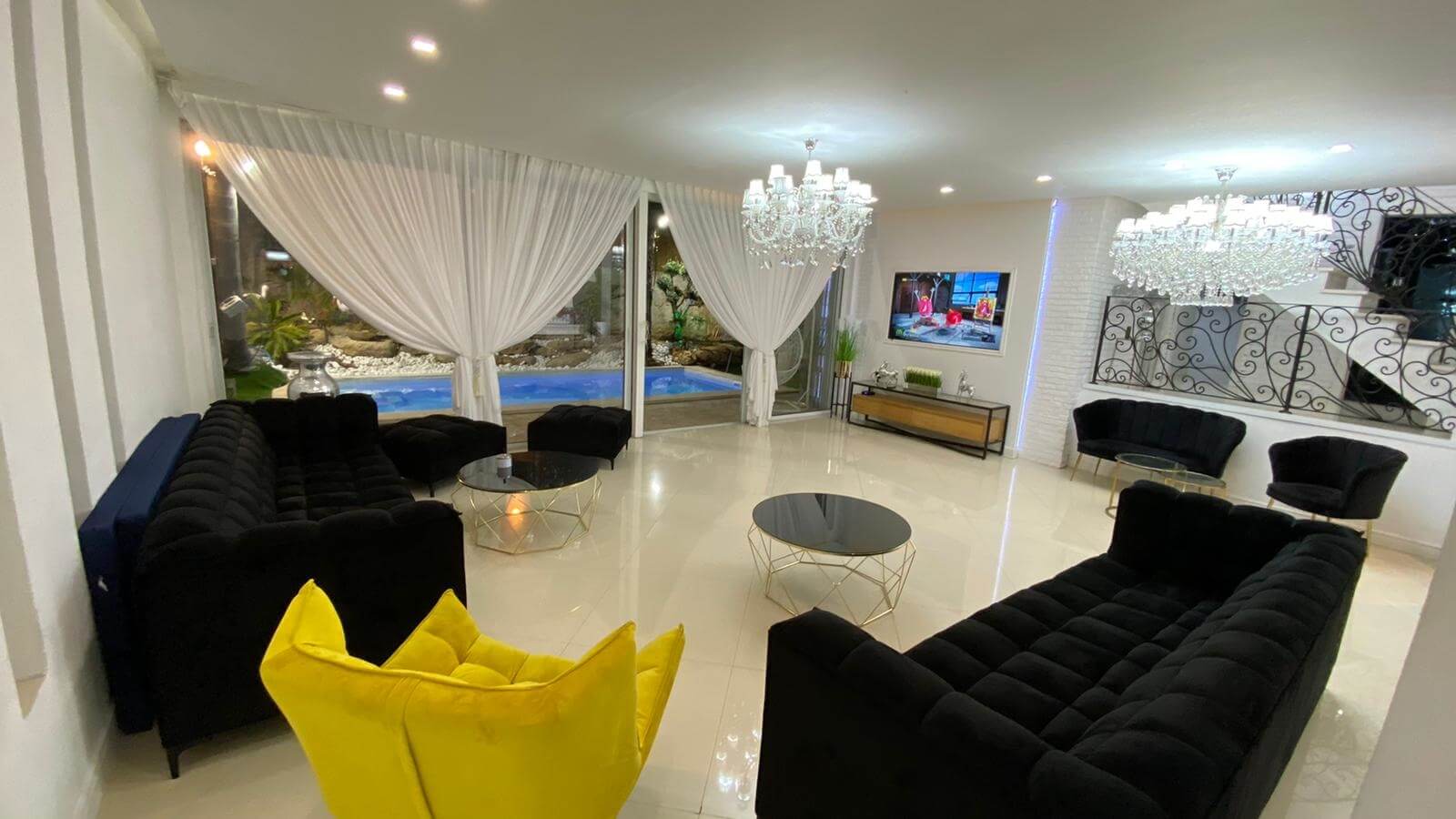 - סלון ענק עם מערכת ישיבה ומסך טלוויזיה בגודל 75' עם חיבור לנטפליקס ולמגוון ערוצים