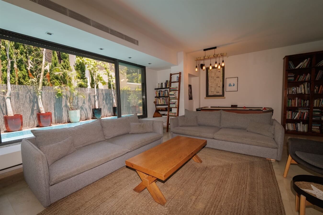 - סלון גדול ומרווח עם ספות ישיבה ולינה, כורסאות, מסך טלוויזיה עם ערוצי ספורט, שולחן הוקי אוויר וחלונות פנורמיים המשקיפים אל החצר הקסומה