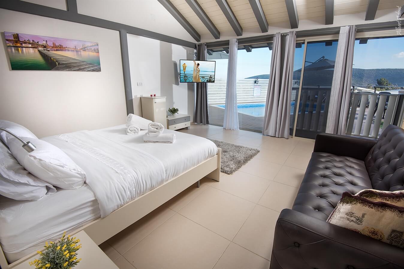 הינה אחת מ-3 חדרי השינה. גדולה במיוחד, מעוצבת בסטייל מרשים וכוללת טלוויזיה בכבלים, ארונית איחסון, פינת ישיבה נעימה, חדר רחצה וחלון פנורמי שמוביל למתחם הבריכה.המתחם המשותף -