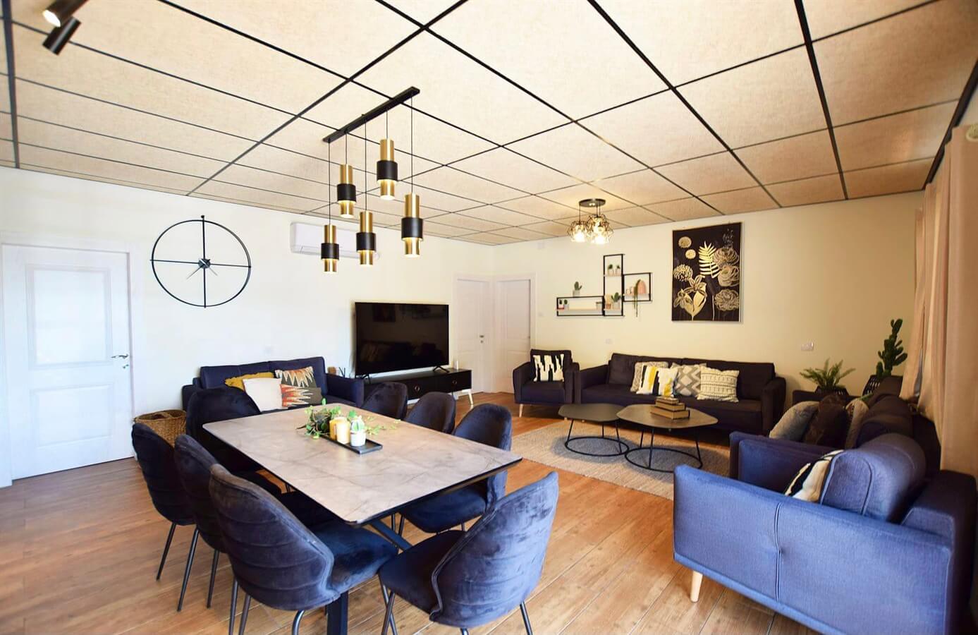 - סלון מרווח ומעוצב עם מערכות ישיבה איכותיות וטלוויזיה 75 אינץ' + נטפליקס
