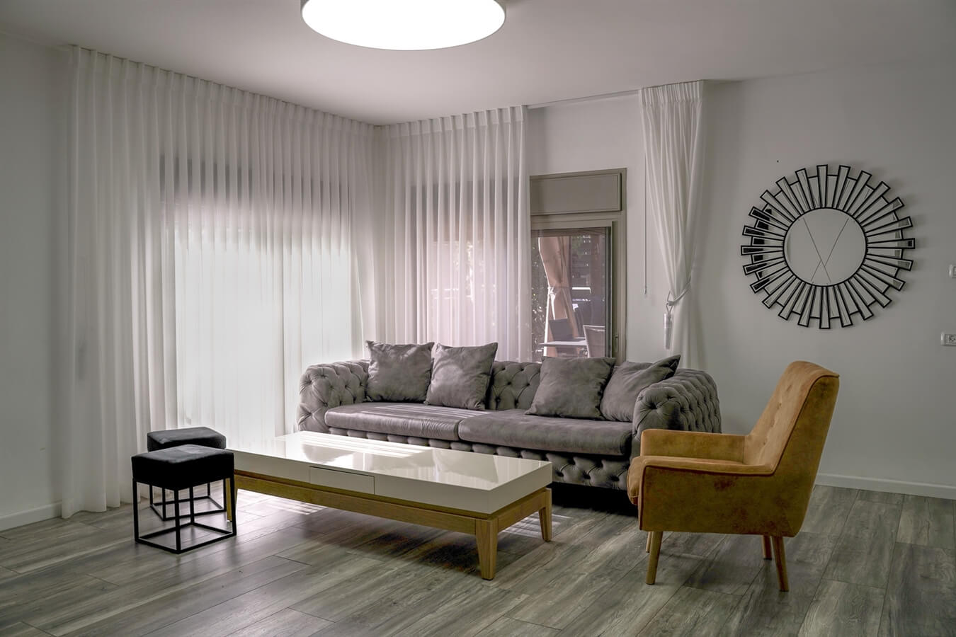 - סלון עם מערכת ישיבה וטלוויזיה חכמה בחיבור ערוצים