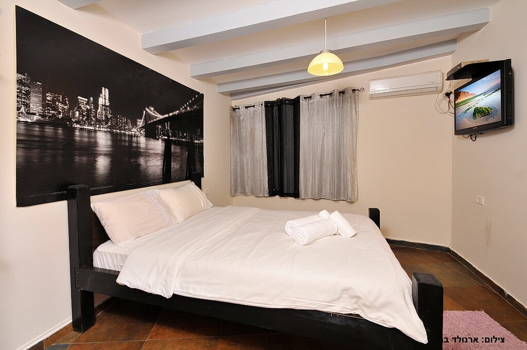 - מיטה זוגית רחבה, מסך טלוויזיית lcd לבילוי רגוע וקומודה עם מראה.
