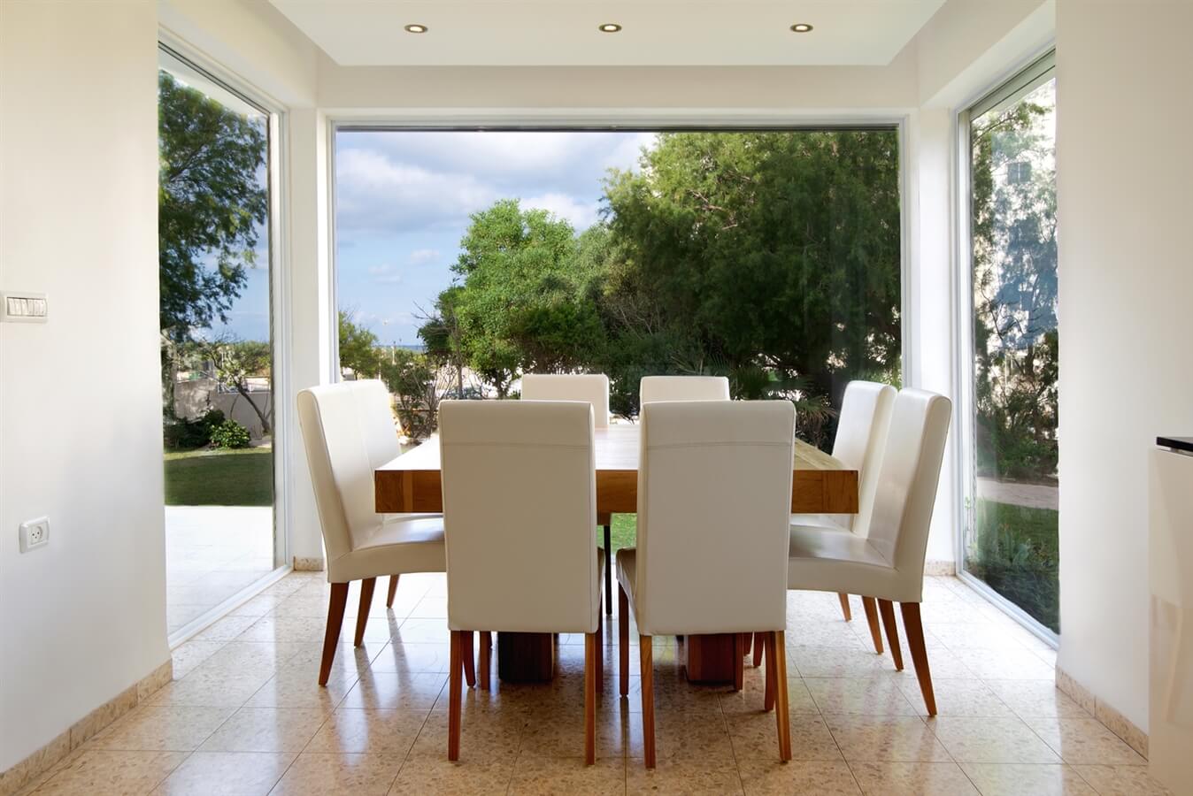 - פינת אוכל משפחתית מוקפת חלונות זכוכית המשקיפות לנוף ולים.