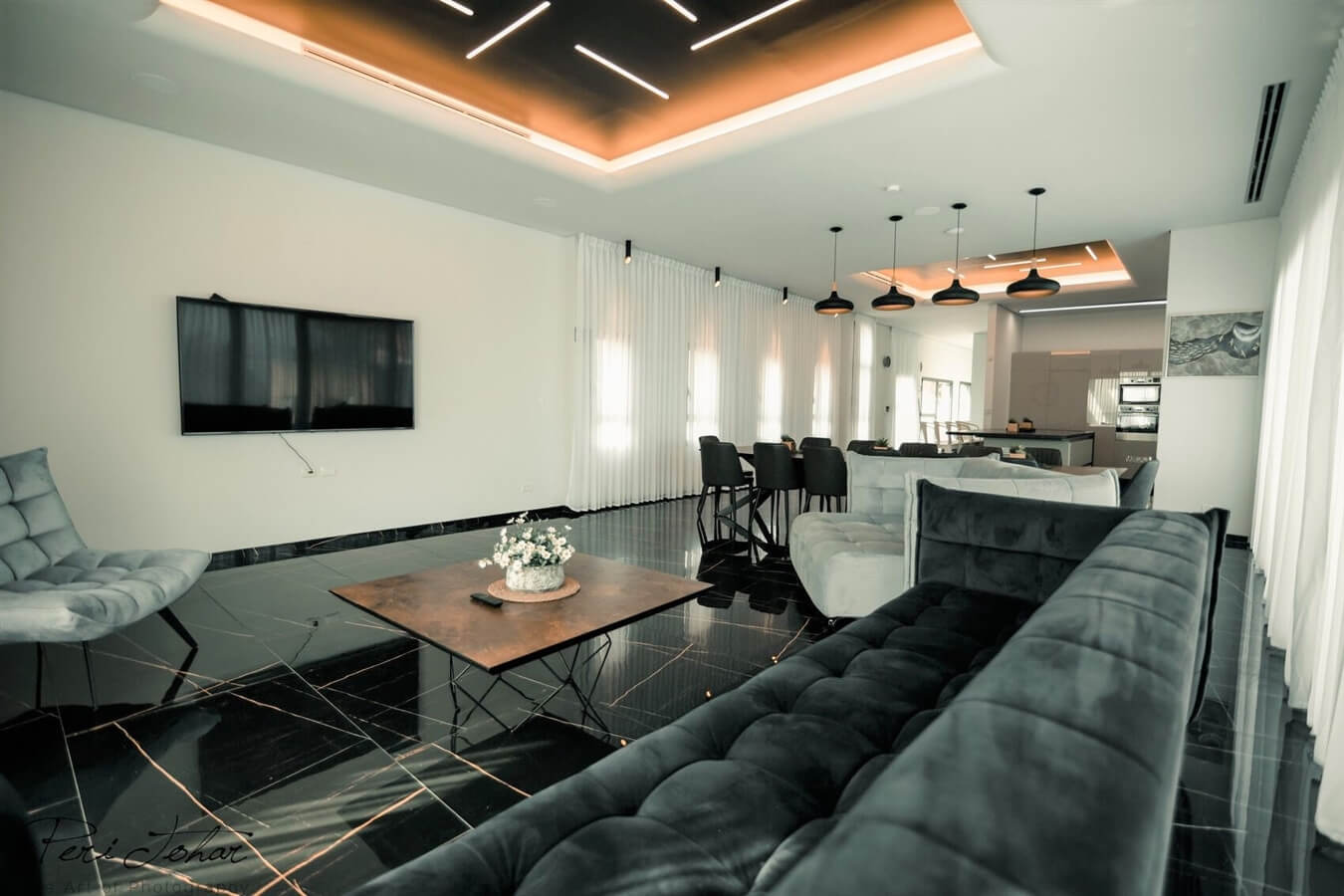 - סלון עם מערכת ישיבה וטלוויזיה חכמה בחיבור כבלים ונטפליקס