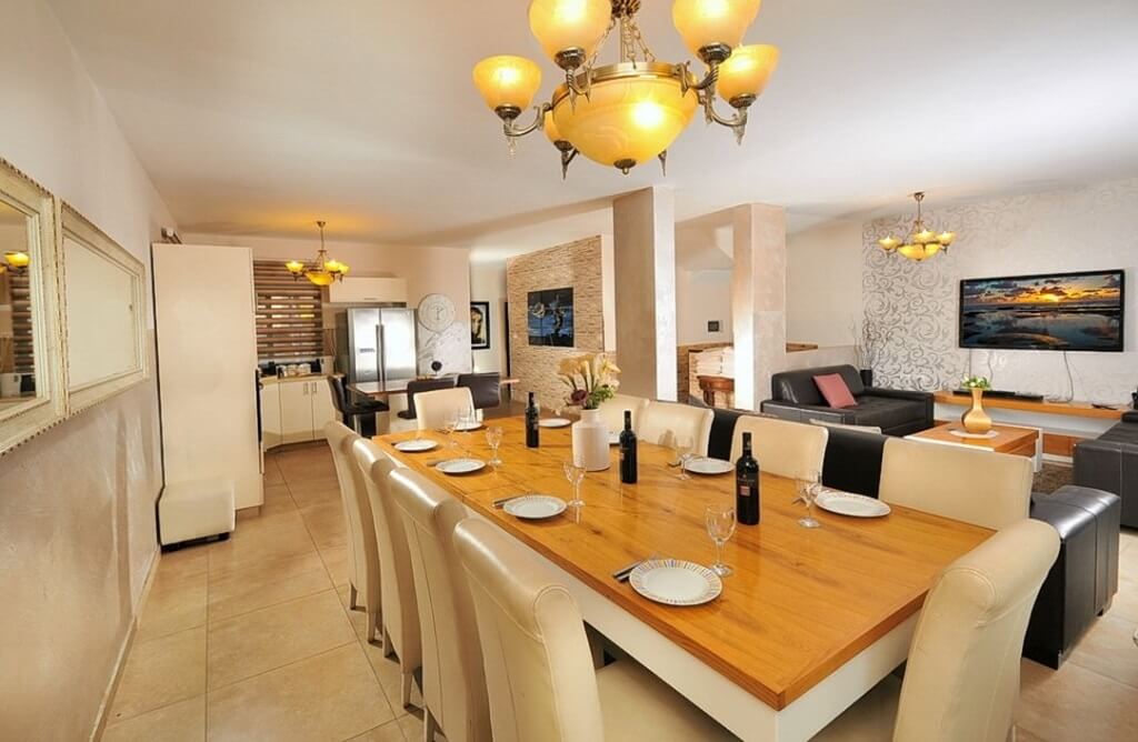- הסלון המרכזי של הוילה ובו מסך lcd ענקי (55') בחיבור למע' קולנוע ביתית איכותית ושולחן אוכל משפחתי.