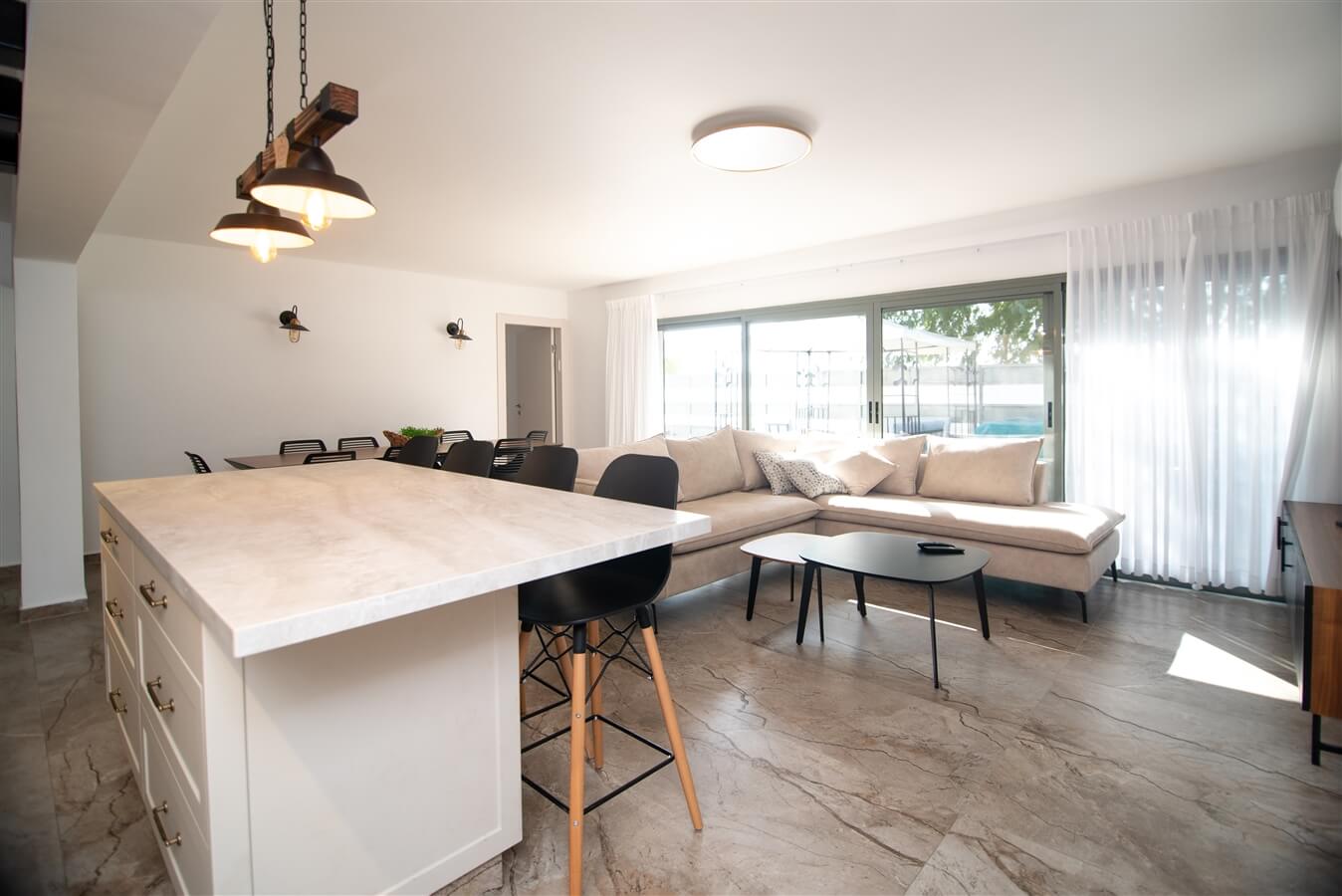 - מטבח מאובזר הכולל מקרר, קומקום, מכונת אספרסו, מקציף, פינת קפה + חלב, תנור, מיקרוגל, כלי אוכל ובישול, אי גדול ונוח עם כיסאות בר