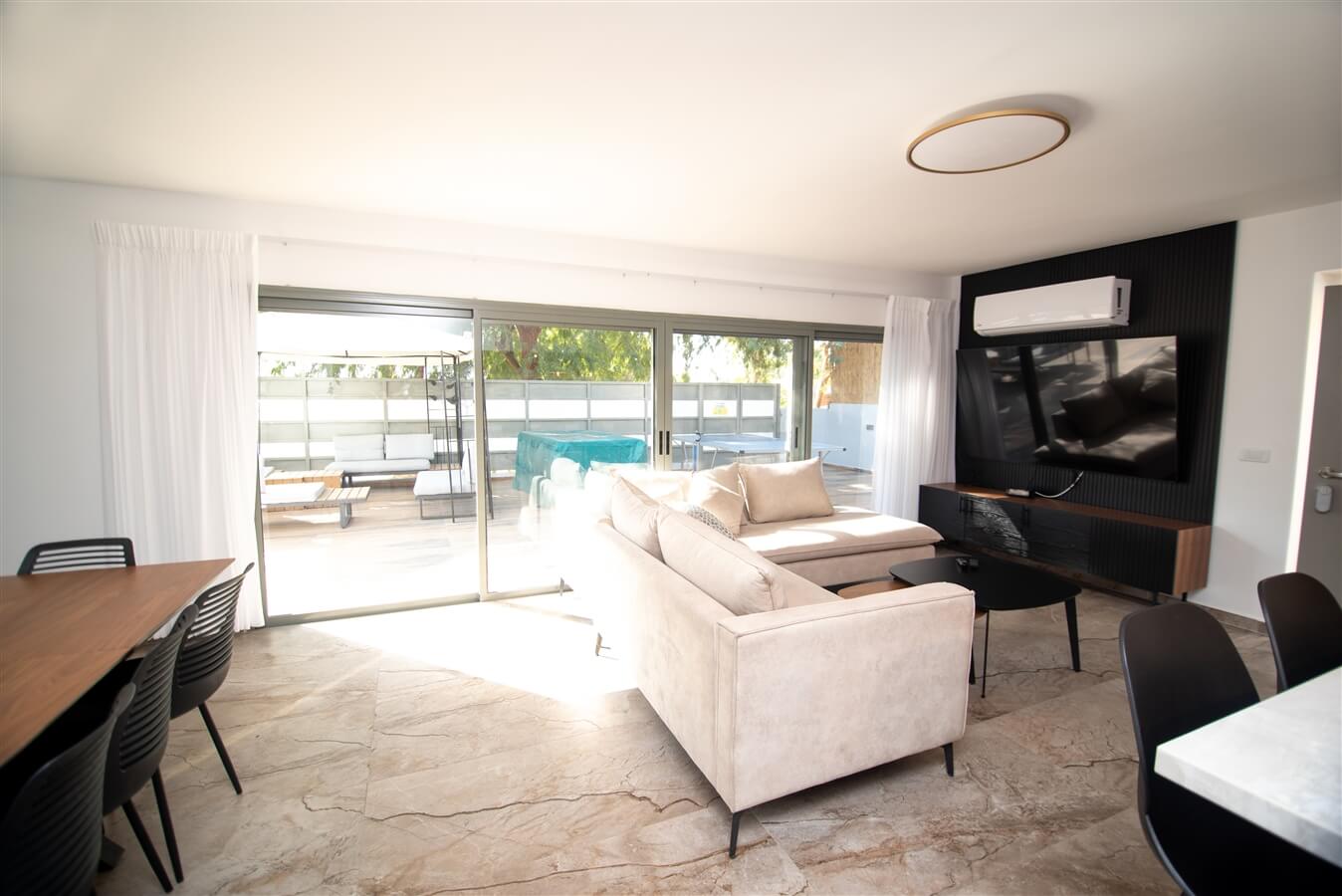 - סלון מפנק עם פינת ישיבה גדולה וטלוויזיה חכמה בחיבור לכבלים ולנטפליקס