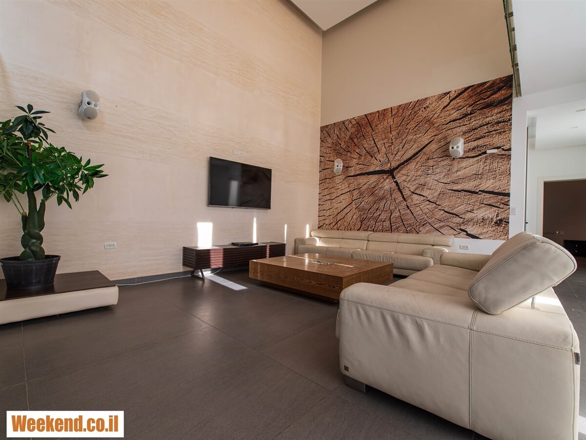 - פינת אוכל מעץ וסלון עם מערכת ישיבה מעור אל מול מסך טלוויזיה ענק.