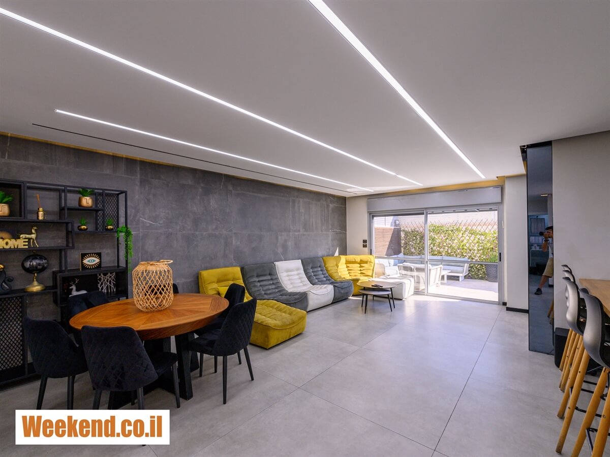 - חלל אורחים משותף עם פינת אוכל הצמודה למטבח מול הטלוויזיה הגדולה ושולחן אוכל עגול