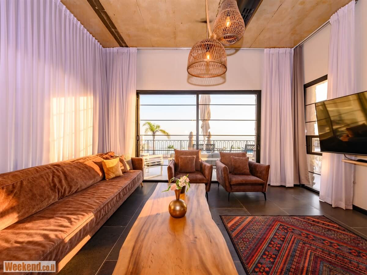 - סלון מרווח עם מערכת ישיבה וטלוויזיה חכמה בחיבור ערוצים