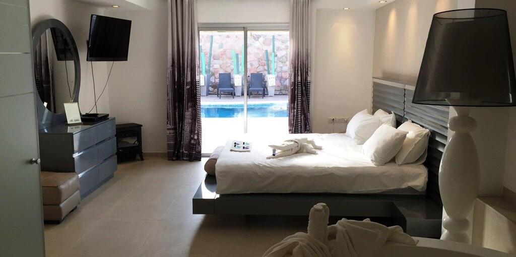 סוויטת הנשיא - בעלת אופי יוקרתי עם מיטת קינג סייז מרווחת, טלוויזיה בלווין, חדר רחצה ויציאה ישירה לבריכת השחיה והחצר.