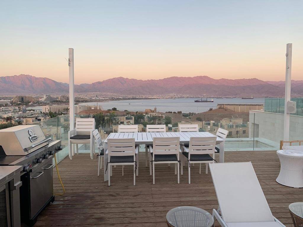 במתחם החוץ תוכלו להנות מטסת שמש מטופחת בחיפוי דק עץ מול נוף הים והמפרץ-