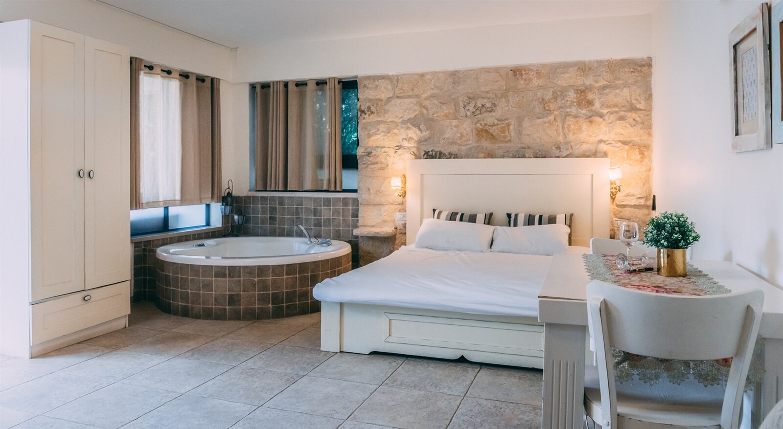 סוויטות ממוזגות ומרווחות לחופשה זוגית באווירה כפרית מחוברת לסביבה עם חלונות פנורמיים המשקיפים לבחוץ, ג'קוזי זרמים שקוע, חדר רחצה, טלוויזיית lcd, חיבור לכבלים, שולחן בר, מטבחון עם מיקרוגל, קומקום חשמלי, פינת קפה ותה, חלב, מתוקים, פירות טריים, בקבוק יין ומכונת אספרסו.
