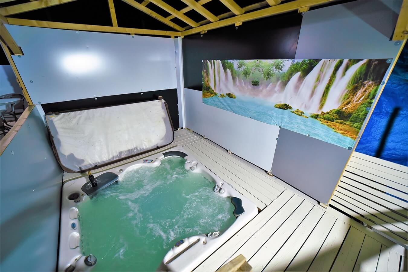 חצר מטופחת עם בריכה, ג'קוזי ספא מקורה, שולחנות משחק ועמדת מנגל
