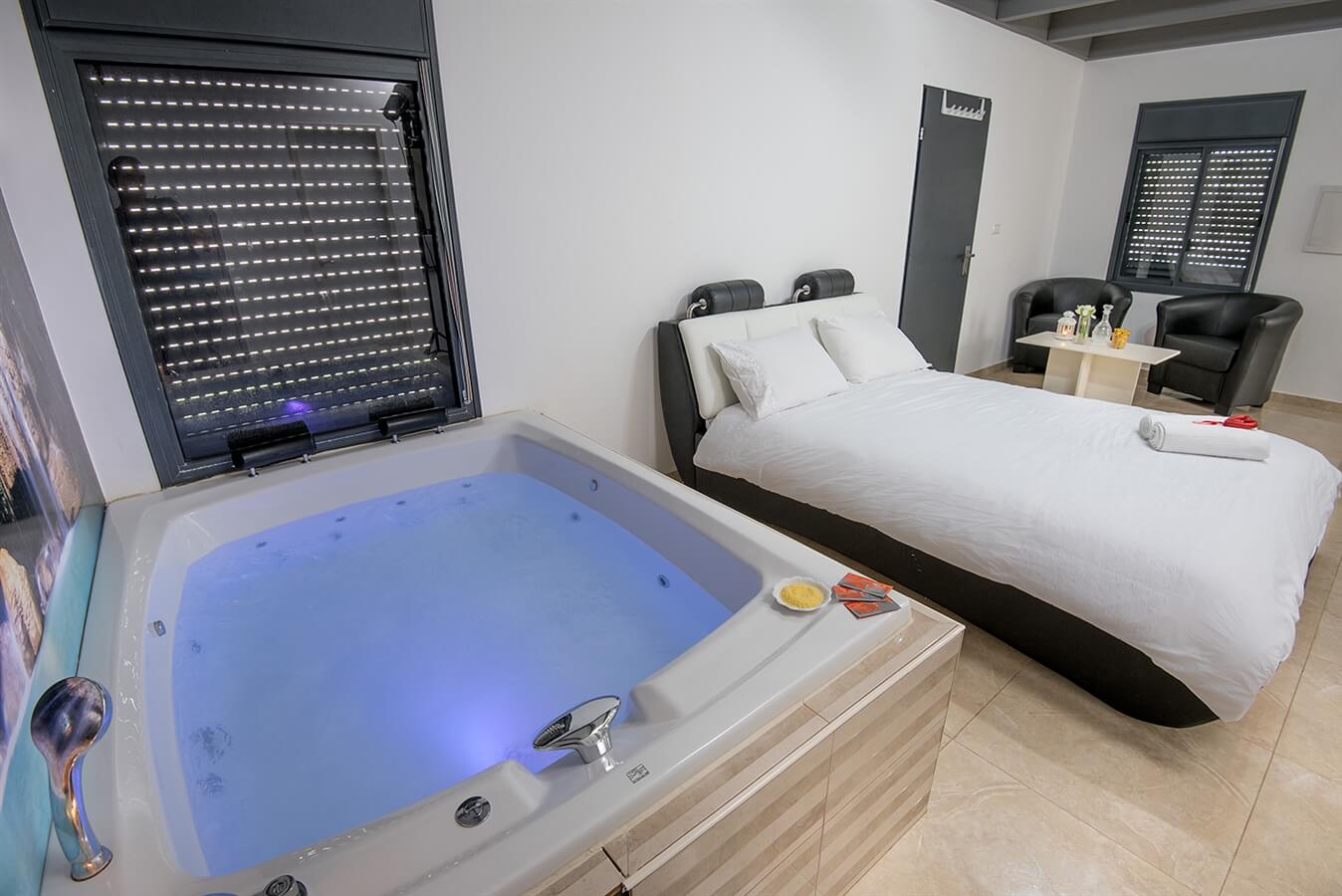 יחידת נופש מרווחת הבנויה בשני מפלסים. הסוויטה מתאימה לאירוח של עד זוג + 2 ובה תמצאו מיטה זוגית מתכווננת, ג'קוזי זרמים מפנק, מטבח המצויד עם מקרר, כיריים, מיקרוגל ופינת קפה, פינת אוכל מקסימה, טלוויזיה בכבלים, מפלס נפרד לילדים ומרפסת פרטית עם בריכה פרטית מגודרת (המחוממת ומקורה בעונה) ופינת ישיבה.