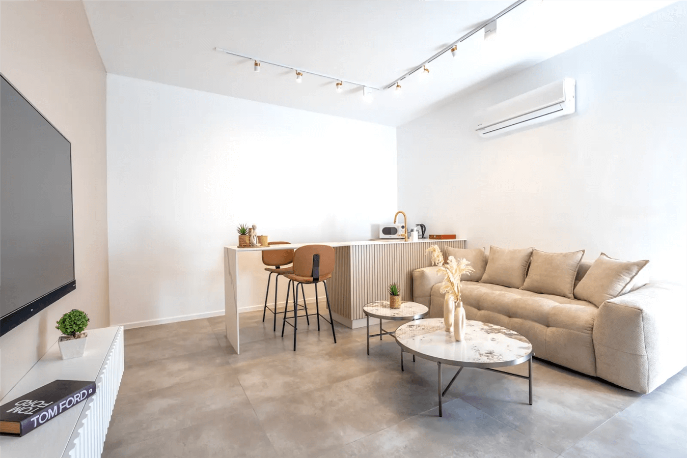• סלון מרווח עם ספה וטלוויזיה חכמה