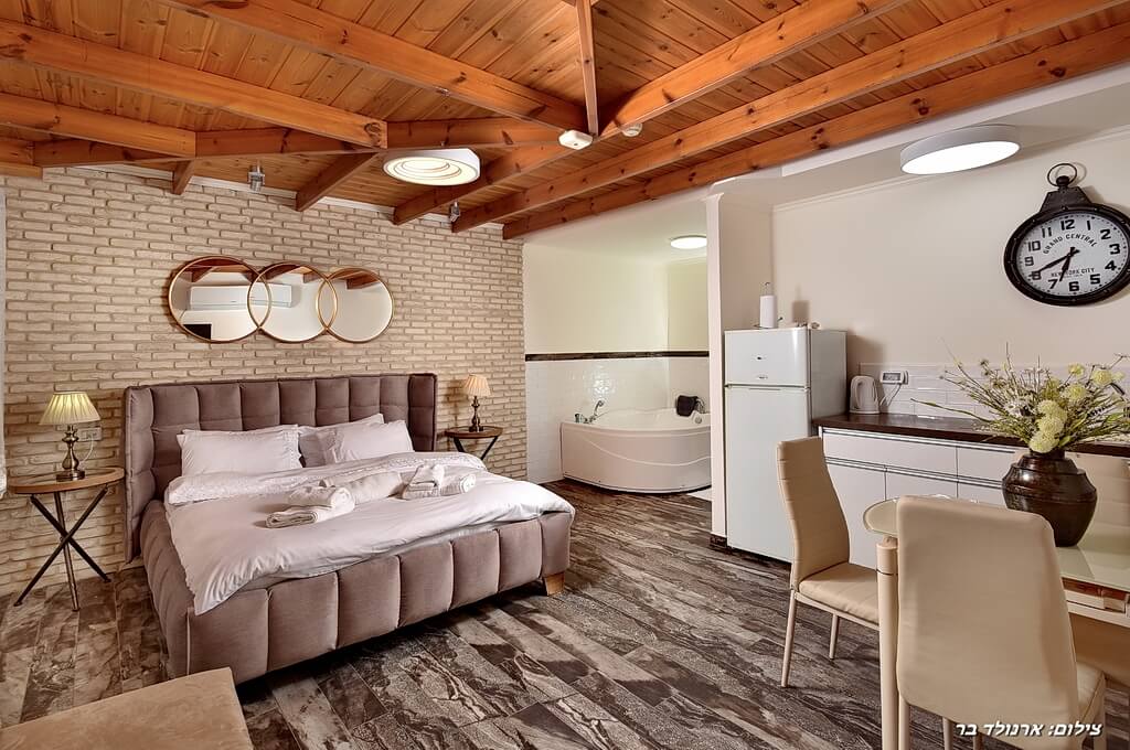 - חדר שינה עם מיטה זוגית, ג'קוזי פרטי וחדר רחצה מאובזר עם מגבות, חלוקים וסבונים