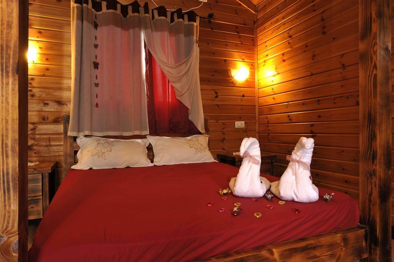 בקתת עץ מפנקת באווירה רומנטית לאירוח זוגות אוהבים. בבקתה מיטה זוגית מרווחת, ג'קוזי ענק, טלוויזיה בכבלים, אינטרנט אלחוטי ומטבחון מאובזר. מהבקתה יציאה לחצר פרטית מטופחת ונעימה.