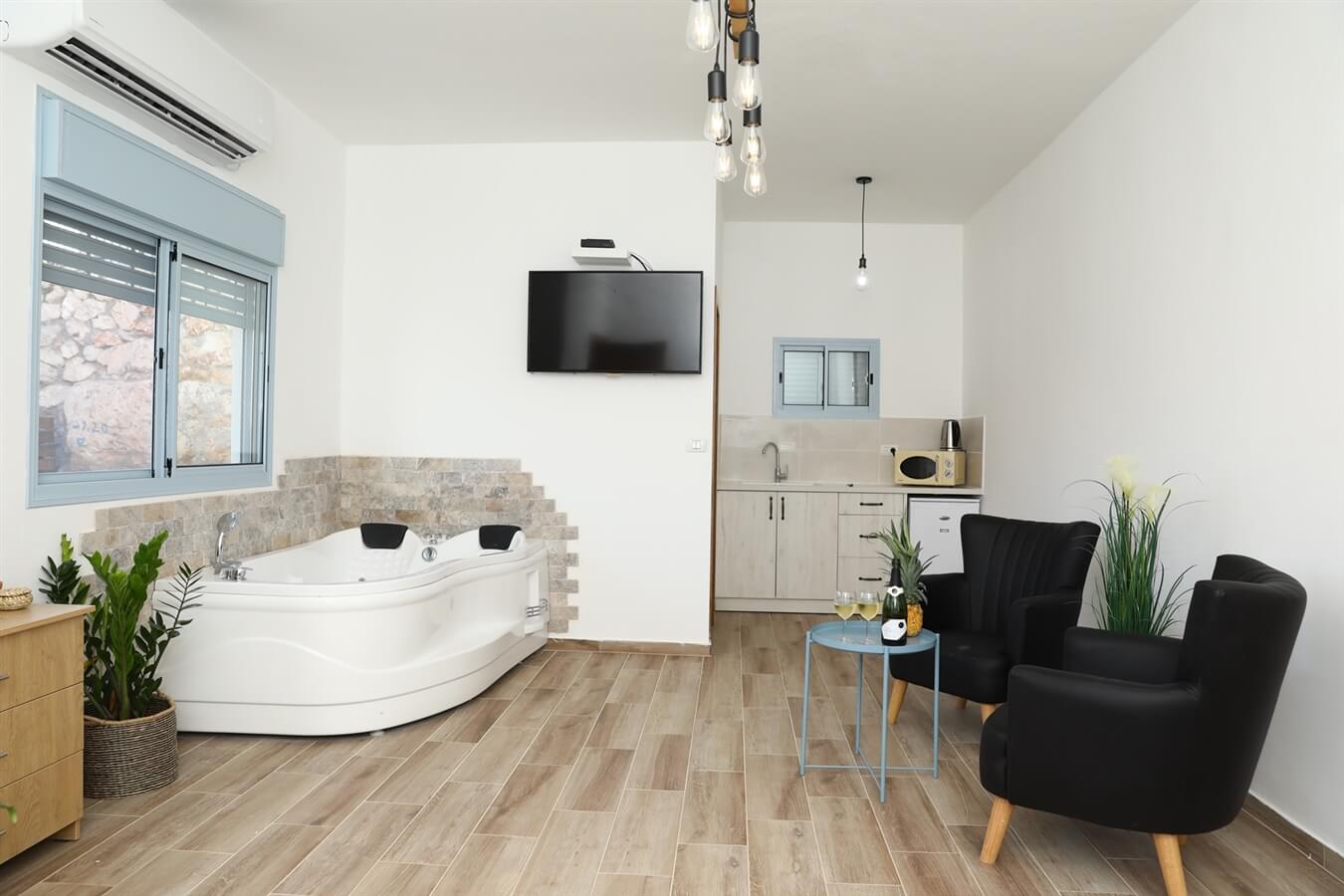 בצימרים הנעימים תיהנו מ ג'קוזי זוגי פינתי, מיטה זוגית מפנקת עם מזרן אורטופדי, מרפסת פרטית עם פינת ישיבה, טלוויזיה עם חיבור לכבלים, מטבחון מאובזר בפינת קפה, קומקום, מקרר, מיקרו וכיריים חשמליות, פינת ישיבה בתוך היחידות, מיזוג אוויר וחדר רחצה מאובזר.