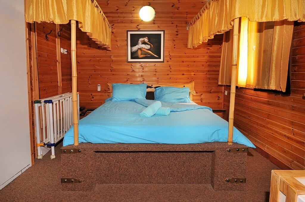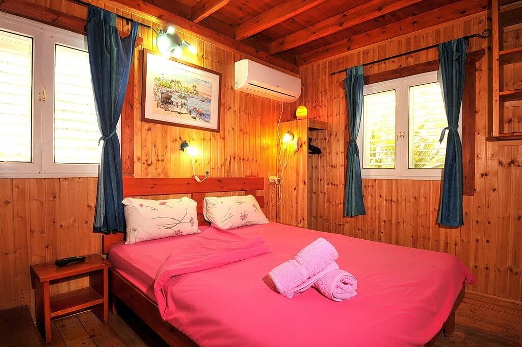 בקתה מרווחת ונעימה המיועדת לזוג + 3 ילדים ובה חדר שינה להורים עם מיטה זוגית נעימה, ג'קוזי גוזי מפנק, חדר רחצה נפרד ובו תחליבי רחצה, מייבש שיער ומגבות, סלון מרווח עם מסך lcd בכבלים, מטבחון מאובזר הכולל כיריים, מיקרוגל, מקרר, פינת קפה ומכונת אספרסו, מסחטת מיץ, כלי בישול וכלי אוכל. בחצר הבקתה מרפסת פרטית עם פינת ישיבה ומנגל ובריכת שכשוך לילדים , בקוטר 3 מטר' ובעומק 80 ס"מ, השימוש בבריכה באחריות ההורים.