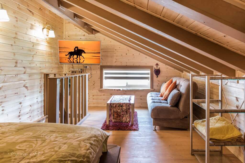 בקומה העליונה - חדר הורים עם מיטה זוגית גדולה המצופה עץ, שידות לאחסון, מסך lcd המחובר ללווין ופינת ישיבה הנפתחת למיטה נוספת.