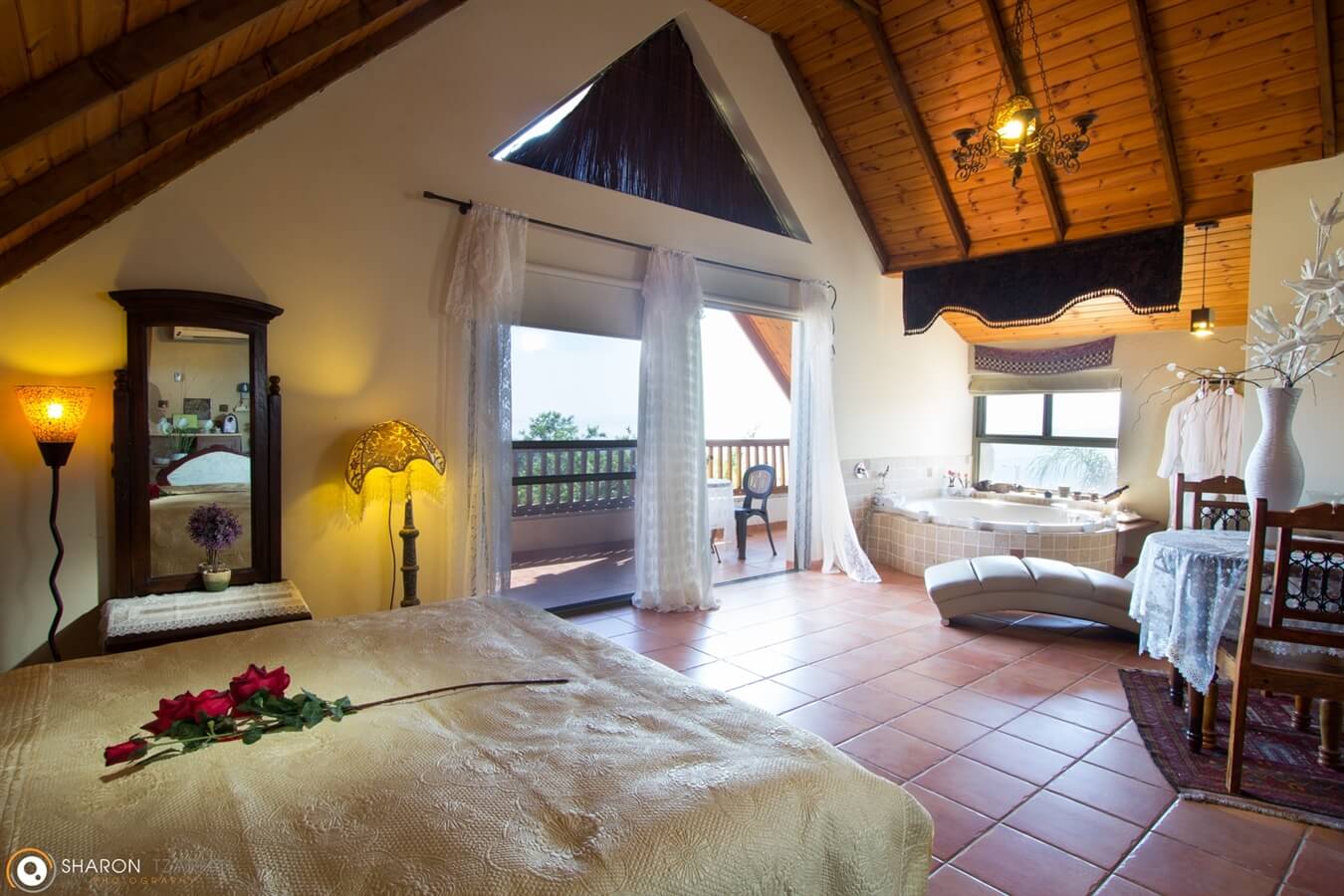לבקתות העץ חצר פרטית עם ערסלים ופינות חמד קסומות ואילו לסוויטות המפוארות מרפסת גבוהה עם נוף פנורמי מהפנט לכנרת ולרמת הגולן.