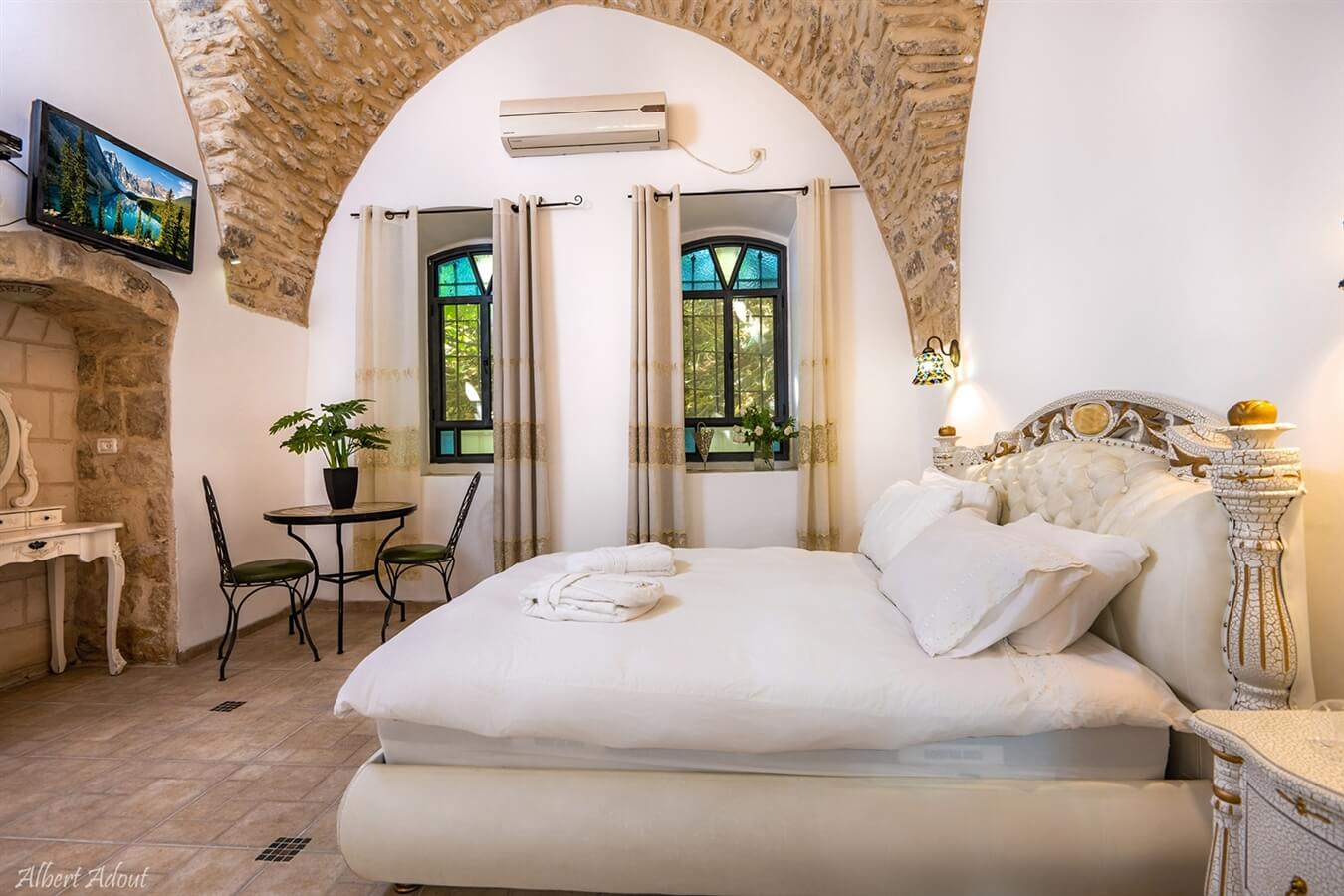 סוויטת בוטיק הבנויה באבן ומתאימה לאירוח זוגי / זוג + 2. בסוויטה מיטה זוגית מעוצבת ומרווחת, מזרן אורטופדי, פינת טואלט, חדר רחצה, תחליבים מבושמים, מקרר מיניבר, ערכת קפה ותה, פינת ישיבה נעימה, מסך צפיה שטוח וחיבור לכבלים.