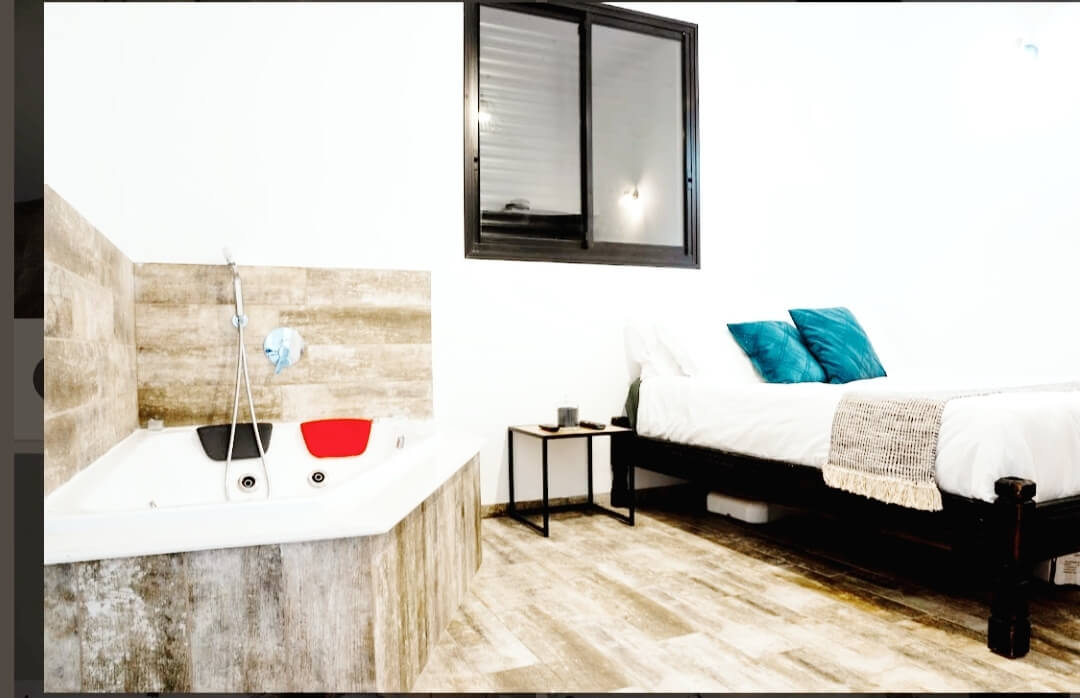 - חדר שינה עם ג'קוזי פרטי, מיטה זוגית, ארונית, קומודה וטלוויזיה חכמה עם חיבור לערוצי HOT
