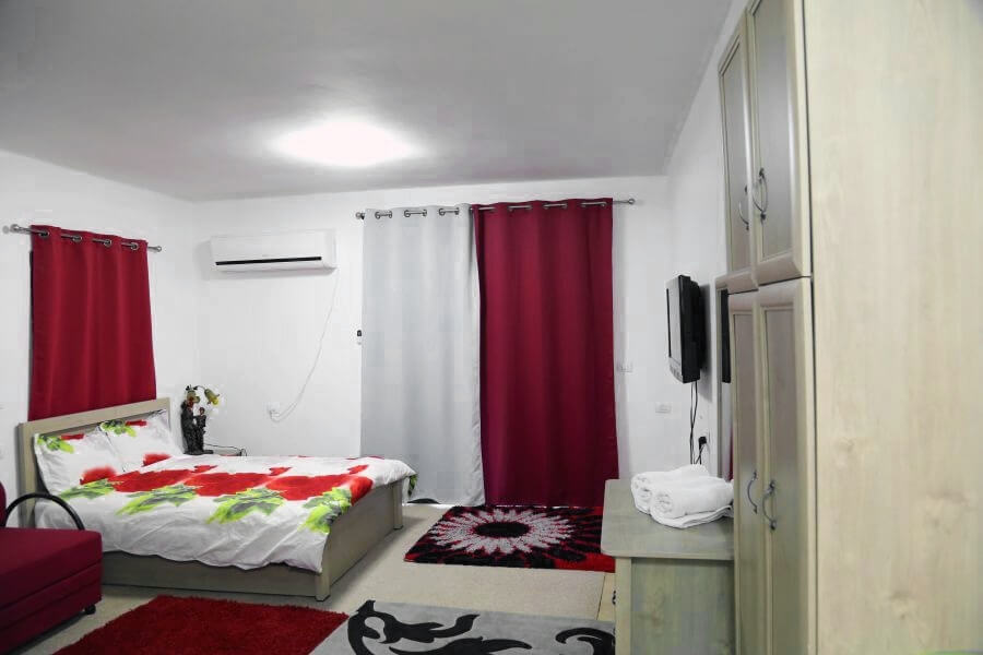 מיטה זוגית נוחה, סלון נעים עם טלוויזיה בכבלים, חדר רחצה עם סבונים ריחניים ומגבות נקיות, שידות איפור ומטבחון מאובזר.