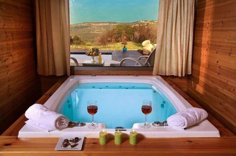 - ג'קוזי מלבני גדול הפונה לחלון דרכו ניבט נוף גלילי מרהיב.