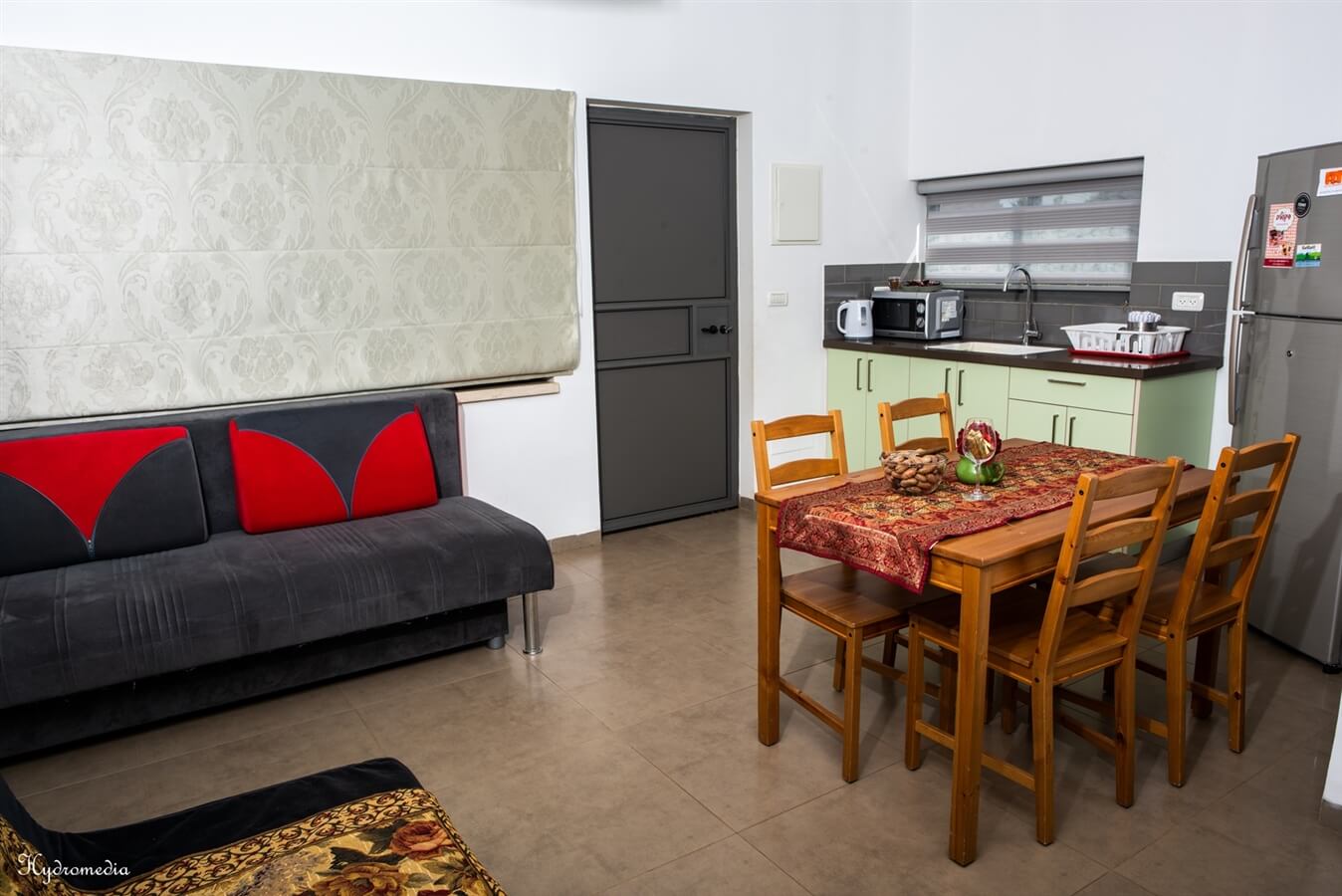 בדירה 2 חדרי שינה, חדר רחצה, סלון, מטבח ומרפסת גינה. המטבח מאובזר במקירוגל, מקרר, כלי הגשה, כיריים ופינת קפה ותה. לצד המטבח שולחן אוכל כפרי, סלון מרכזי ומסך lcd עם חיבור לכבלים. מדירה יציאה למרפסת פטיו הפונה למרבדי הדשא.