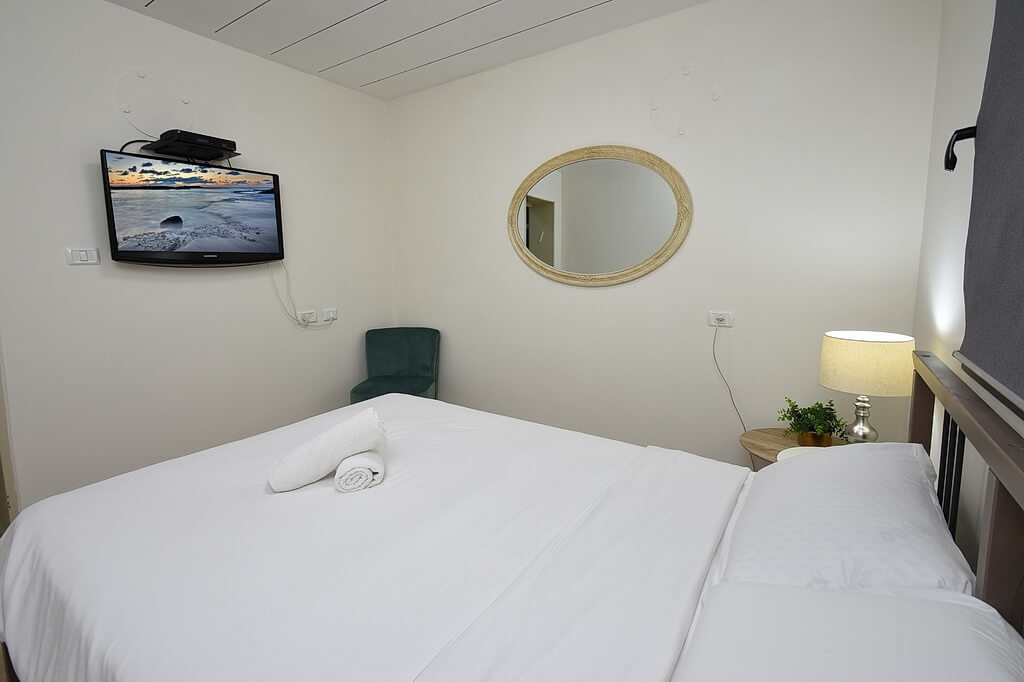 - מיטה זוגית עם מסך טלוויזיה נוסף בחיבור לכבלים