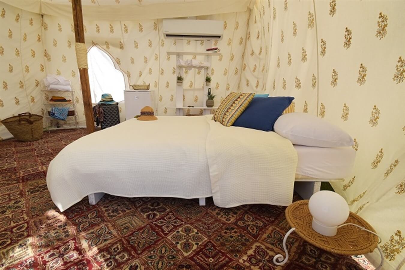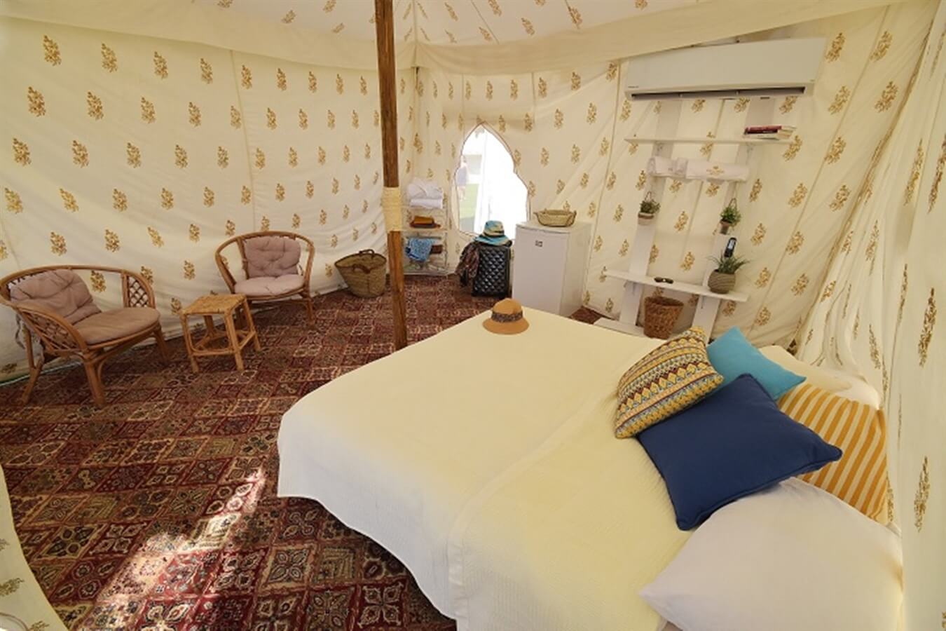 המתחם בנוי על מדשאה ענקית וכולל שמונה אוהלי יוקרה איכותיים ומפנקים במיוחד. האירוח מתאים לזוגות, משפחות, קבוצות וכל מי שמחפש נופש המשלב בין טבע ופינוק. בכל אחד מהאוהלים תיהנו ממיזוג אוויר, מקלחון ושירותים פרטיים. האוהלים הזוגיים כוללים מיטה זוגית מעץ ואופציה להוספת שני מזרונים. האוהלים הכפולים כוללים 2 מיטות זוגיות וניתן להוסיף עוד 4 מזרונים. מחוץ לאוהלים מפוזרות פינות ישיבה רבות המשקיפות אל חוף הים הפרטי ואל נוף עוצר נשימה שנראה כמו תצלום.